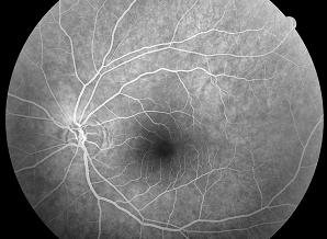 Resim 1: Normal FFA görüntüsü.Damarlarda veya makulada herhangi bir sızıntıya ait parlak renkte beyazlık izlenmemektedir.