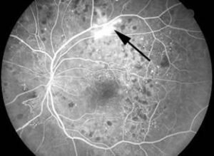 Resim 2: Şeker hastasına ait FFA tetkiki görüntüsü, damarların beyaz boyanması floresein boyası ile dolduğunu göstermektedir. Damar yapısı bozulduğunda floresein dışarı sızmakta ve resimde görüldüğü gibi hiperfloresans (siyah ok) izlenmektedir.