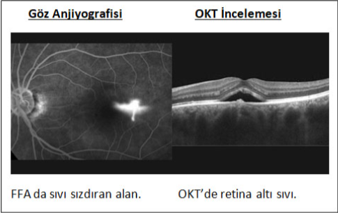 Rutin göz muayenesi sonrasında göz bebekleri damla ile genişletilerek göz arkası (makula) özel mercekler ile muayene edilir. SSR’den şüphe edilirse göz doktorunun gerekli gördüğü göz anjiyografisi ve optik koherens tomografi (OKT-göz tomografisi) tetkiki ile tanı kesinleştirilir. Göz anjiyografisinde kol damarından özel bir boya verilir ve retinada sızıntı yapan alan belirlenir. Hastalığın tedaviye yanıtı ve takibi de OKT tetkiki ile yapılır.